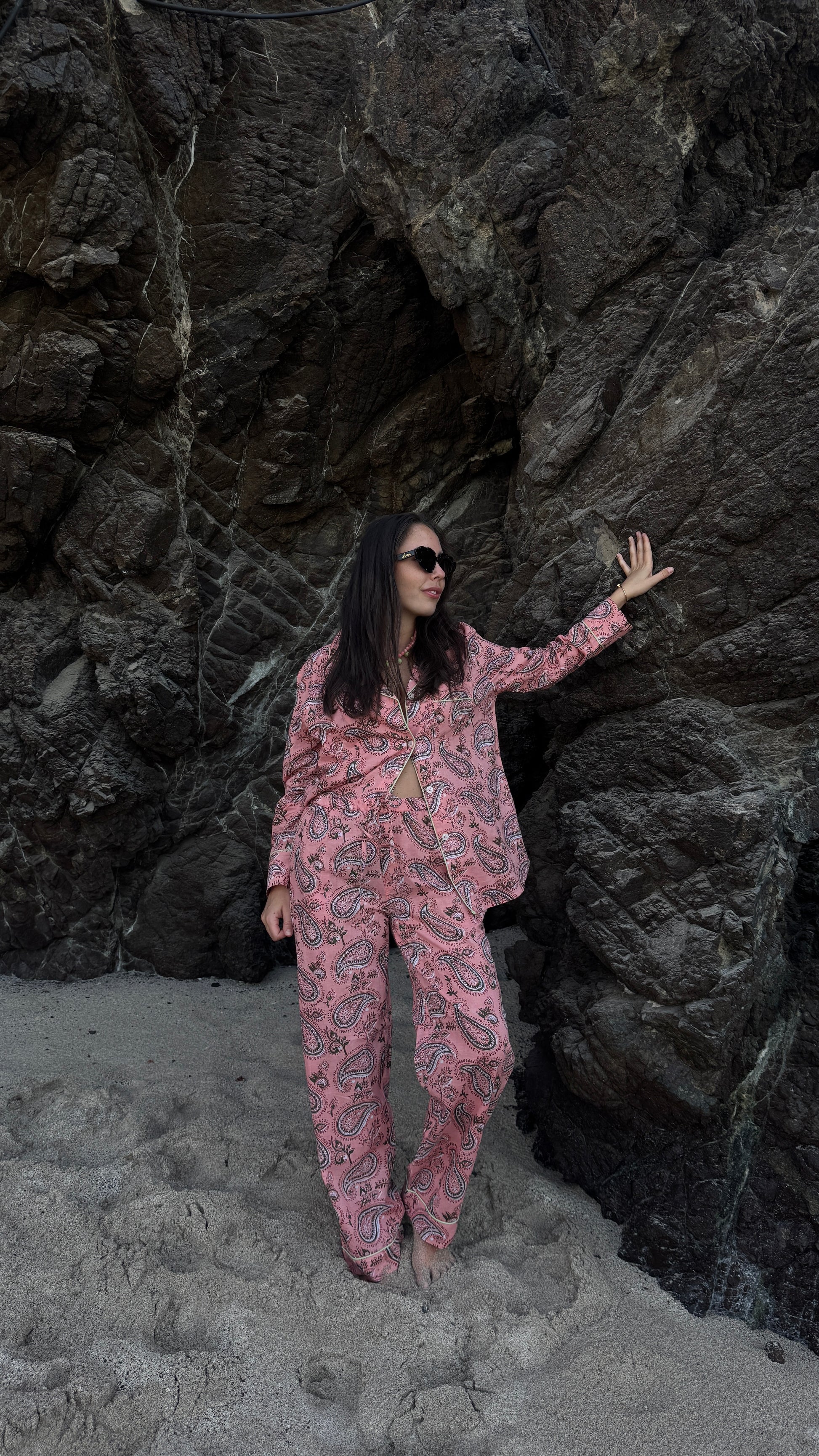 Designed in a classic style, our pyjama set features a cozy long-sleeve blouse and matching long pants, offering the perfect balance of comfort and sophistication. Whether you're lounging at home or stepping out for a day of adventures, these pyjamas are your versatile companion, ready to keep you feeling cozy and looking chic. For the dreamers who refuse to be confined to bedtime, our pyjamas seamlessly transition from sleepwear to streetwear. Simply split and style for a cool and effortless look that's bound to turn heads. Embrace your inner daydreamer and let your imagination run wild as you explore the world in comfort and style.